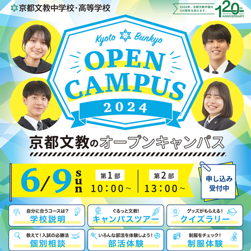 第1回オープンキャンパス[ 6/8(日)第1部10:00~、第2部13:00~ ]お申込み受付中!学校説明、部活体験、キャンパスツアー、個別相談などを実施いたします。私学を考えている方も、そうでない方も、ぜひ一度ご参加ください!活気ある京都文教の雰囲気を感じ... -