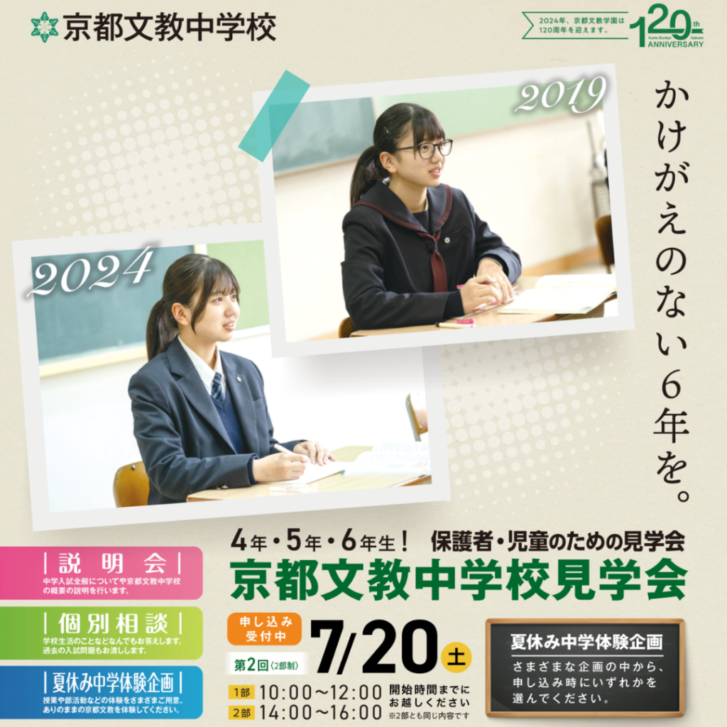 中学入試全般についての説明や本校の概要の説明のほか、生徒・教員によるキャンパスツアーや個別相談、ランチ体験などを予定しています。学校生活のことなどなんでもお答えします。ありのままの京都文教を見学いただき、学校選びの第一歩としてまずは本校... -