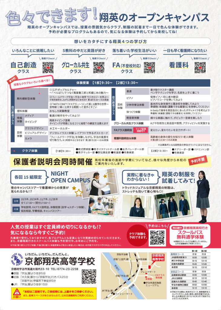 体験授業や保護者説明会、スクールバス体験、キャンパスツアーなど多くの内容を用意しています。